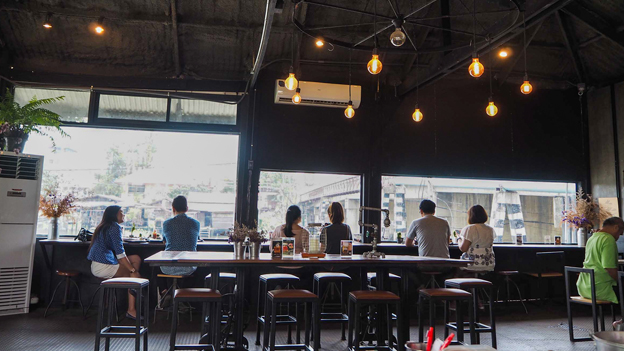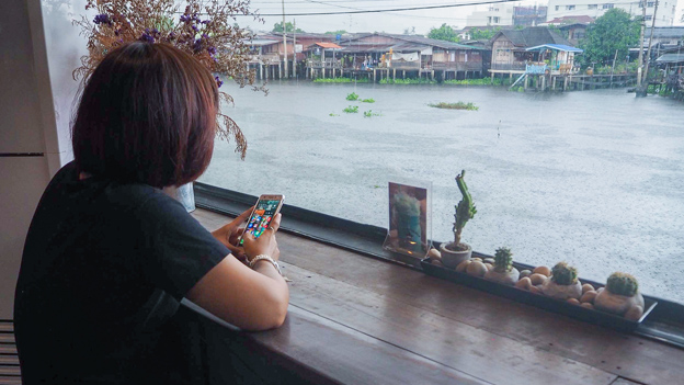 โต๊ะบาร์ริมน้ำในห้องแอร์ จิบกาแฟ เล่นโทรศัพท์ Slow Life ดีจริง ๆ