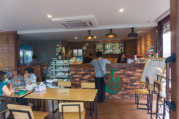 ภายในร้านตกแต่งด้วยโทนสีไม้ และประดับด้วยอิฐแดง เหมาะกับการนั่งจิบกาแฟเพลิน ๆ
