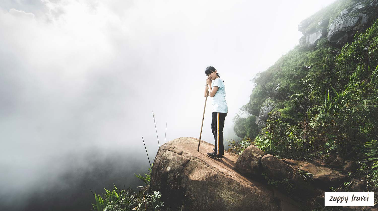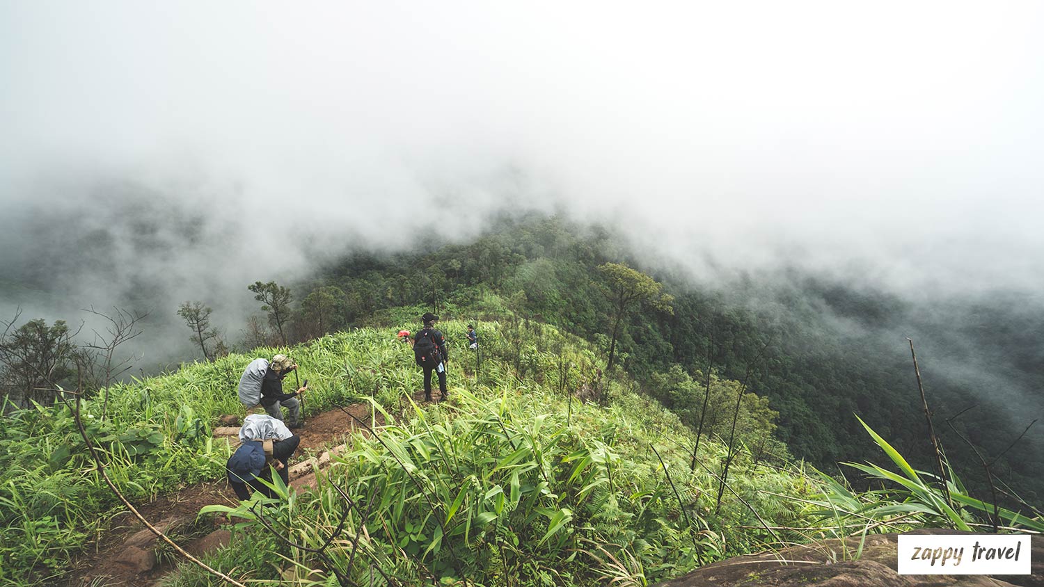 ดูรูปมาถึงตรงนี้ขอแนะนำเพื่อน ๆ นิดนึงนะครับ สำหรับใครไปครั้งแรก รูปต่อไปนี้ถ่ายตรง เนินมรณะ เนินสุดท้าย ที่มีความสูงชันมากที่สุด ได้รูปถ่ายชุดนี้มาโดนความบังเอิญมาก แวะพักเหนื่อยเนินนี้ เหนื่อยโครตจริง ๆ ตอนพักมีหมอกปกคลุมหนามาก มองไม่เห็นอะไรเลย นั่งพักแป๊บเดียวมีลมพัดเอาหมอกออกเห็นเนินและภูเขาฝั่งตรงข้าม เห็นเส้นทางที่เราเดินผ่านขึ้นมา บร๊ะเจ้า!!? ตกใจมาก!!! นี่เราเดินบนสันเขาหรือนี่ แต่ในความตกใจ ยังมีสตินิดหน่อยรีบบอกให้เพื่อน ๆ ไปยืนตรงหน้าผาหิน และได้รูปสวย ๆ เท่ ๆ พอถ่ายรูปเสร็จปุ๊บ หมอกมาทันที ฝนฟ้าอการกาศชั่งเป็นใจอะไรเช่นนี้