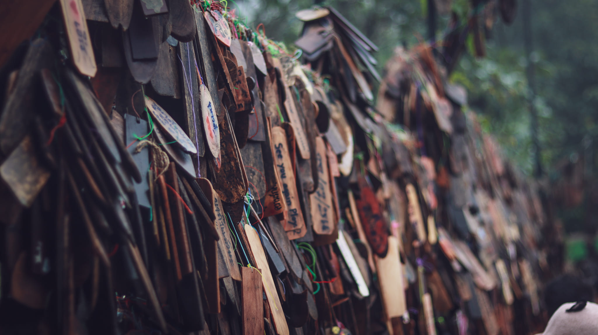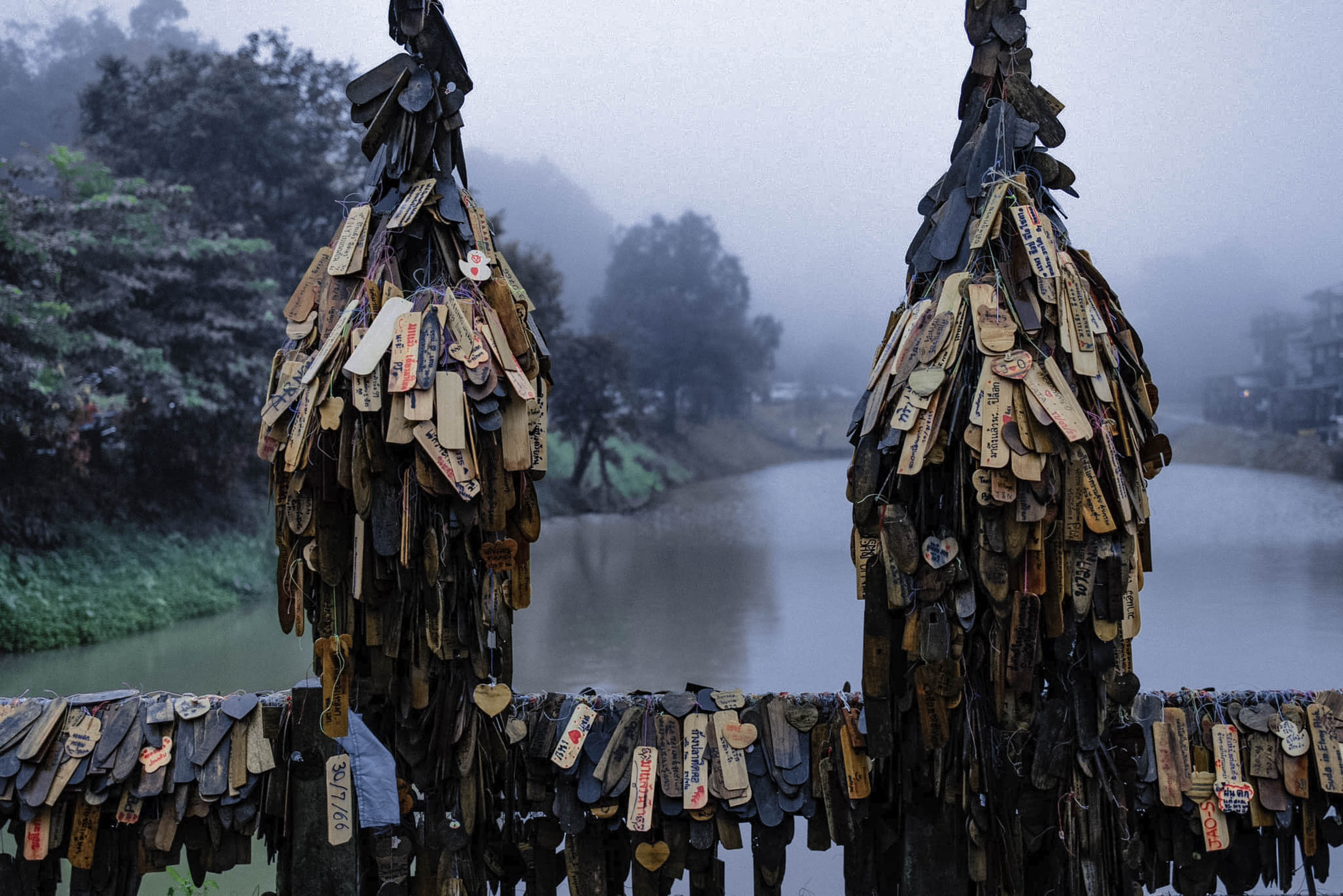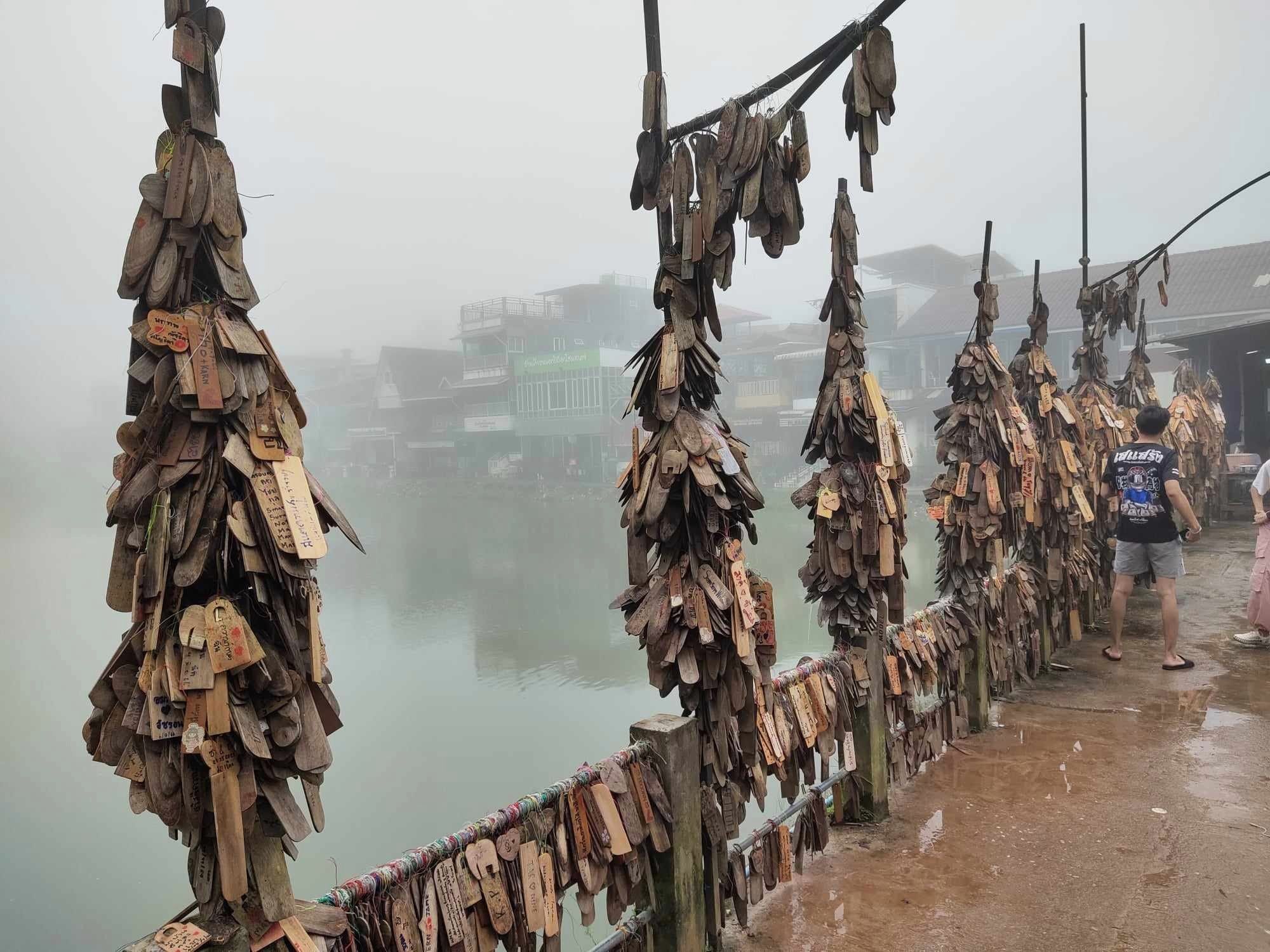 สะพานป้ายไม้ เป็นสะพานบริเวณหน้าหมู่บ้าน โดยตลอดสองเส้นทางจะมีป้ายไม้ห้อยเต็มสองฝั่ง เพื่อให้นักท่องเที่ยวได้เขียนความรู้สึก หรือระบายความในใจลงในป้ายไม้แห่งนี้ แล้วนำมาแขวนไว้ที่สะพาน พร้อมกับถ่ายรูปเก๋ๆ คู่กับป้าย นอกจากนี้ จุดนี้ยังเป็นจุดชมวิวหน้าหมู่บ้านที่สวยงามมากเลยนะ โดยมองจากบนสะพานสามารถมองเห็นสระน้ำขนาดใหญ่และบ้านเรือนบอกเลยว่ามุมนี้สวยมาก