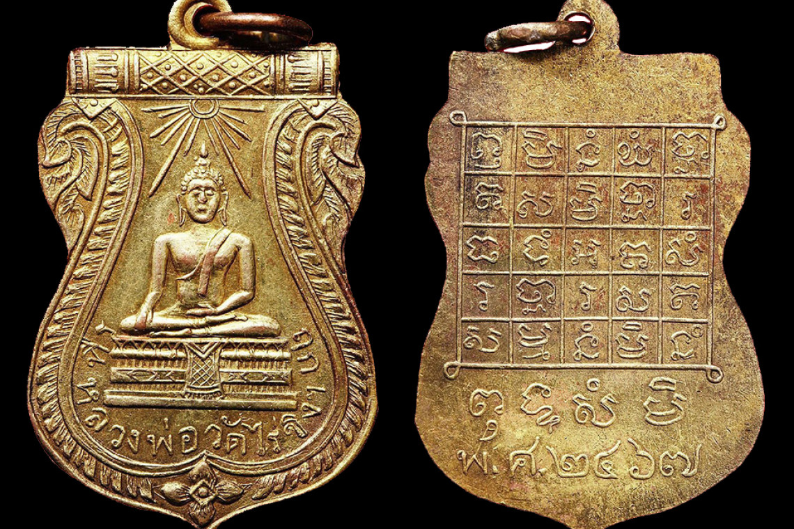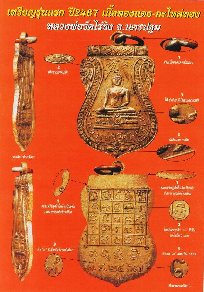 ต่อมาในส่วนของด้านข้างของเหรียญ ตรงบริเวณพระชานุจะมีอักษรภาษาไทยคำว่า “ทืร” และ “ฤก” ซึ่งแปลว่า “ที่รฤก” ทางด้านใต้อาสนะจะมีการจารึกเป็นภาษาไทยว่า “หลวงพ่อวัดไร่ขิง” โดยตรง เมื่อพลิกมาทางด้านหลังของตัวเหรียญ จะปรากฏยันต์ที่มีอักขระขอม ซึ่งนับได้ว่าเป็น “หัวใจของยันต์ใหญ่” ได้มีการจารึกเอาไว้ภายในตารางจำนวน 25 ช่องด้วยกัน หากอ่านตรงตัวจะอ่านได้ว่า “พุท ธัง สะ ระ นัง คัจ ฉา มิ ธัม มัง สะ ระ นัง คัจ ฉา มิ สัง ฆัง สะ ระ นัง คัจ ฉา มิ” และในส่วนของด้านล่างสุดของเหรียญได้มีการระบุปี พ.ศ. ที่สร้างเหรียญ นั่นก็คือ พ.ศ.2467 นั่นเอง