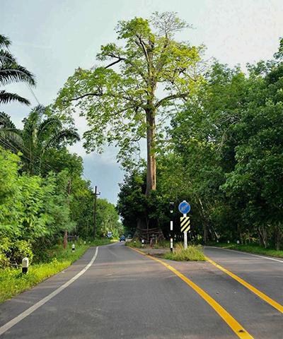 หากสังเกตหลังจากเลี้ยวซ้าย กม.44 ตรงสี่แยกบ้านทำเนียบ ขับเข้าไปตามถนนลาดยางที่จะไปเที่ยวน้ำตกธารทองหรือป่าต้นน้ำบ้านน้ำราด อำเภอคีรีรัฐนิคม แล้วพบกับความแปลกสุดอึ้ง เพราะขับตรงอยู่ดีๆ ถนนถูกแบ่งเป็นสองซีก เพราะมีต้นไม้ขนาดใหญ่ "ต้นงิ้ว" ขึ้นขวางอยู่ตรงกลาง พร้อมตั้งศาลผูกผ้าสีไว้กราบไหว้เทพารักษ์รึนางไม้ จุ๊ๆๆ อย่าริคิดจะหยุดจอดรถเพื่อลงไปถ่ายภาพเซลฟี่กันเชียวล่ะ โปรดระลึกไว้เสมอถนนหนทางตรงนี้มันแคบ มียวดยานพาหนะแล่นผ่านอย่างรวดเร็วสวนกันตลอด และเกือบจะเป็นแนวทางตรงซะด้วย อาจได้รับอุบัติเหตุถึงแก่ชีวิตและทรัพย์สินได้ง่ายๆกันนะครับ