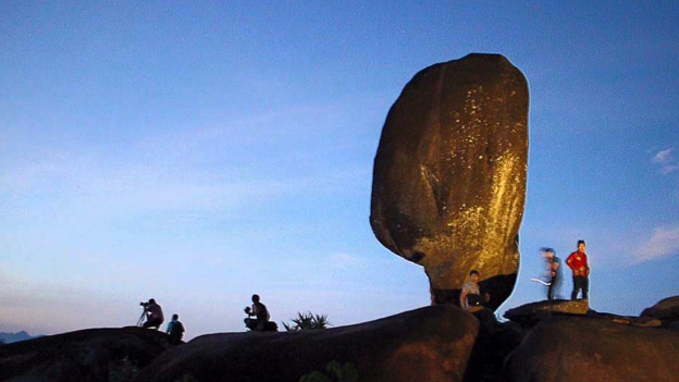 ลักษณะของก้อนหินธรรมชาติรูปพัดในบางมุมของบ้านยวนสาว อำเภอคีรีรัฐนิคม สถานที่เที่ยวกำลังบูมอีกหนึ่งแห่ง ขนาดสูงประมาณ 5-6 เมตร ฐานกว้างประมาณ 1 เมตร ตั้งวางอยู่บนฐานก้อนหินใหญ่มหึมา มีช่องเล็กๆสามารถมองทะลุได้ รอบๆเป็นผืนป่าเขียวดูเพลิดเพลินตาอย่างยิ่ง แต่หากมากันเช้าตรู่จะได้เจอทั้งหมอกทั้งตะวันพร้อมบรรยากาศสดชื่น สุดทึ่งในความมหัศจรรย์ของหินธรรมชาติก้อนใหญ่รูปลักษณ์แปลกตาที่ยังคงตั้งตระหง่านอยู่อย่างมั่นคง โดยไม่เซไหวล้มหล่นลงไปในผืนป่าด้านล่างมาตั้งแต่ไหนแต่ไรแล้ว