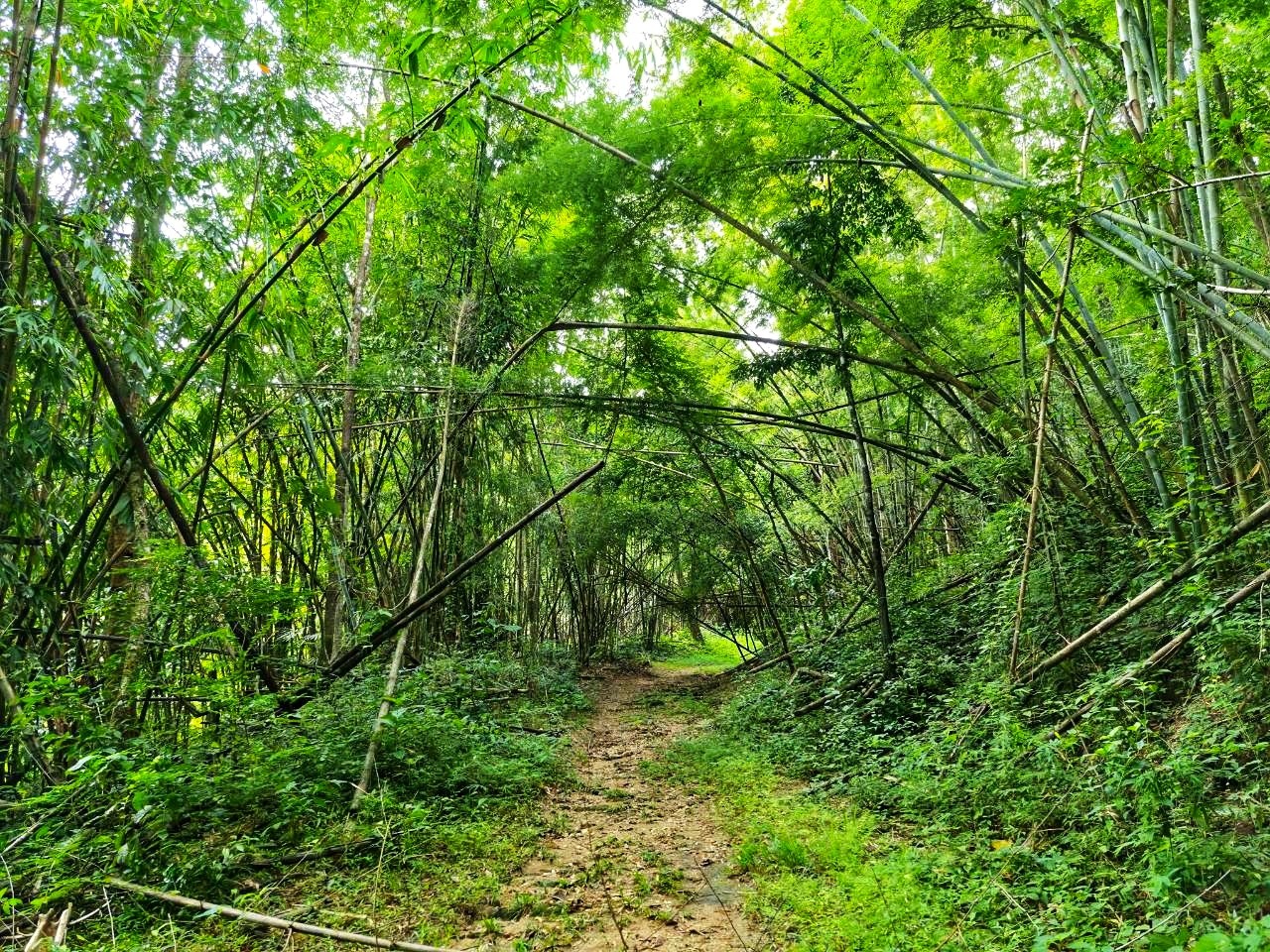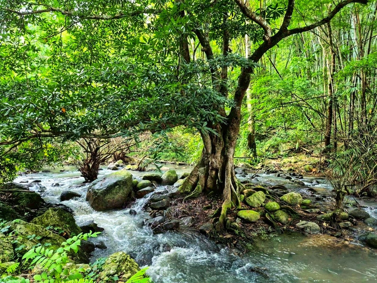 บรรยากาศโดยรอบเต็มไปด้วยป่าไผ่สูงเรียงรายตลอดแนวลำธาร