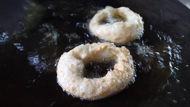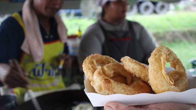 พิงจอดสังเกตการณ์ แค่เห็นม้วนๆเป็นวงกลมลงทอดราดน้ำมันร้อนๆ คล้ายทอดไข่ดาวในกะทะ จนเหลืองดูน่ารับประทาน พักสะเด็ดไม่ให้อมน้ำมัน ตักใส่ถาดกระดาษจำหน่ายอยู่อย่างต่อเนื่องไม่ขาดสายตามจำนวนคิวออเดอร์ของลูกค้า เฉิ่มเชยเอ่ยถามก่อน "แผ่นเท่าไหร่?" ได้คำตอบ "สิบบาท" ตรูนึกในใจกลมๆขนาดเท่ากำไลข้อมือผู้ใหญ่ทำไมราคาถึงหรูนัก แต่พอได้หยิบชิ้นอุ่นๆขึ้นมากัดในปากโดนตรงกระเปาะที่ใส่เนยผสมนมข้นหวานโรยเกล็ดน้ำตาลทรายปน บรรจงม้วนห่อเสมือนไส้อยู่ด้านในเช่นขนมโดนัท แบบเกือบจะกรอบนอกนุ่มในโดยแท้