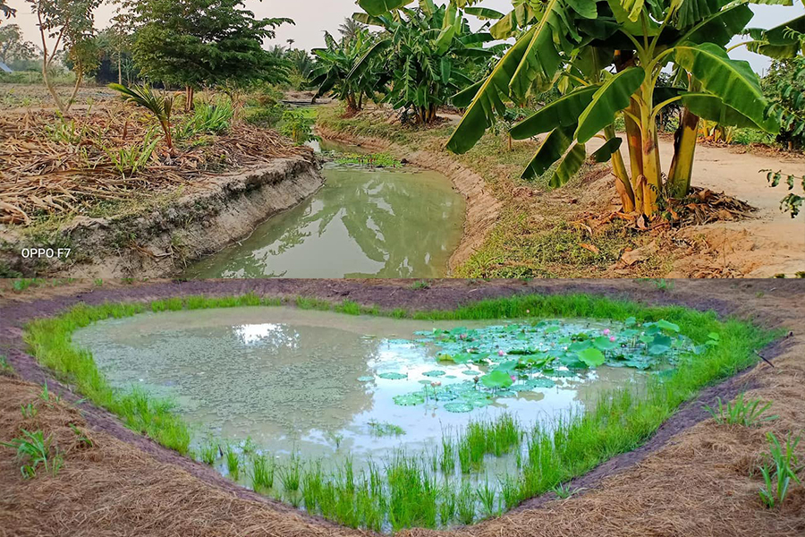 ส่วนการขุดออกแบบ จะเน้นให้สโลป ให้เข้ากับธรรมชาติเพราะธรรมชาติไม่เป็นเส้นตรงค่ะ จึงสร้างออกมาเพื่อให้เหมาะกับธรรมชาติ เพื่อที่ปลาจะวางไข่กันได้รวมถึงดูทิศทางลมและแสง โดยให้อาจารย์ช่วยออกแบบให้เหมาะทิศทางลมและแสง นอกจากนี้ยังปลูกหญ้าแฝกกั้นคันน้ำ เพื่อไม่ให้ชายฝั่งเซาะ ส่วนการปลูกพืช สลับหมุนเวียนกันไป ไม่ว่าจะเป็นกล้วย น้อยหน่า ขนุน
