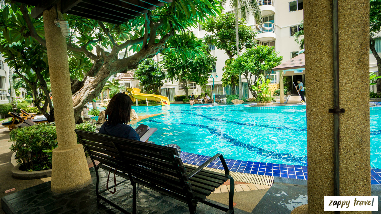 บรรยากาศที่พัก สะดวกสบาย มีร้านค้าสะดวกซื้อ และติดใกล้ทะเล สามารถเดินไปก็ถึง จุดเด่นของที่พักนี้เห็นจะเป็นสระน้ำที่กว้าง มีสไลด์ลื่นเหมาะสำหรับพาเด็กๆครอบครัวไปเที่ยว มีสระเด็กและสระผู้ใหญ่แบ่งโซนกันอย่างลงตัว