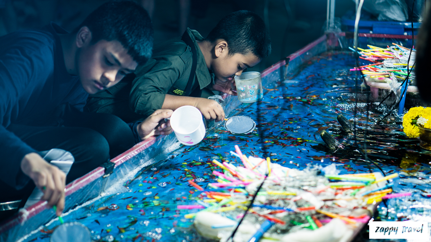 มีจุดให้จับปลาด้วยนะ 3 ไม้ 20 บาท เล่นไปหลายรอบ ขาดทุกรอบ ปลาติดมาได้แค่ 2 ตัวเองจ้า ทางพ่อค้าใจดี เลยใส่ปลามาให้เพิ่ม เด็ก ๆ ดีใจมากค่ะ