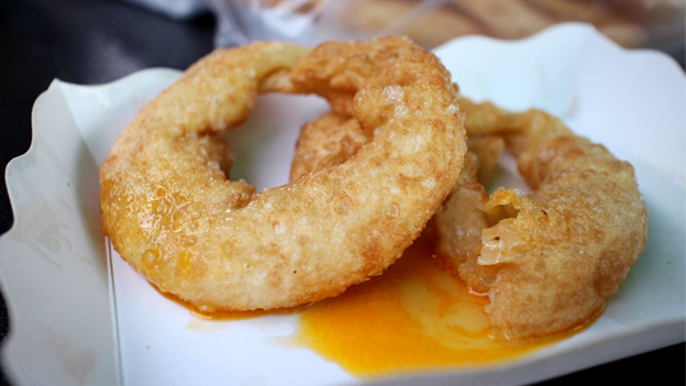 พิงจอดสังเกตการณ์ แค่เห็นม้วนๆเป็นวงกลมลงทอดราดน้ำมันร้อนๆ คล้ายทอดไข่ดาวในกะทะ จนเหลืองดูน่ารับประทาน พักสะเด็ดไม่ให้อมน้ำมัน ตักใส่ถาดกระดาษจำหน่ายอยู่อย่างต่อเนื่องไม่ขาดสายตามจำนวนคิวออเดอร์ของลูกค้า เฉิ่มเชยเอ่ยถามก่อน "แผ่นเท่าไหร่?" ได้คำตอบ "สิบบาท" ตรูนึกในใจกลมๆขนาดเท่ากำไลข้อมือผู้ใหญ่ทำไมราคาถึงหรูนัก แต่พอได้หยิบชิ้นอุ่นๆขึ้นมากัดในปากโดนตรงกระเปาะที่ใส่เนยผสมนมข้นหวานโรยเกล็ดน้ำตาลทรายปน บรรจงม้วนห่อเสมือนไส้อยู่ด้านในเช่นขนมโดนัท แบบเกือบจะกรอบนอกนุ่มในโดยแท้
